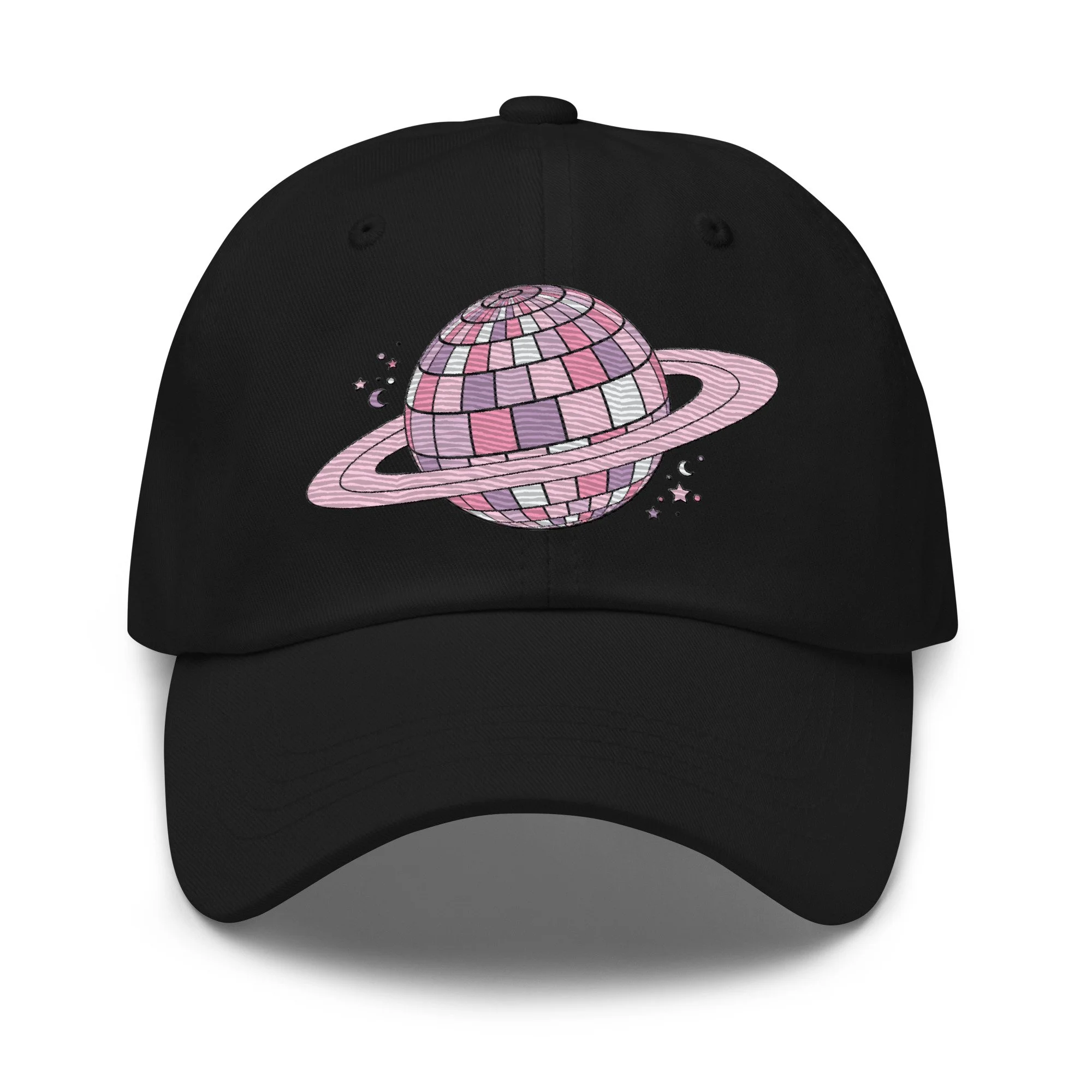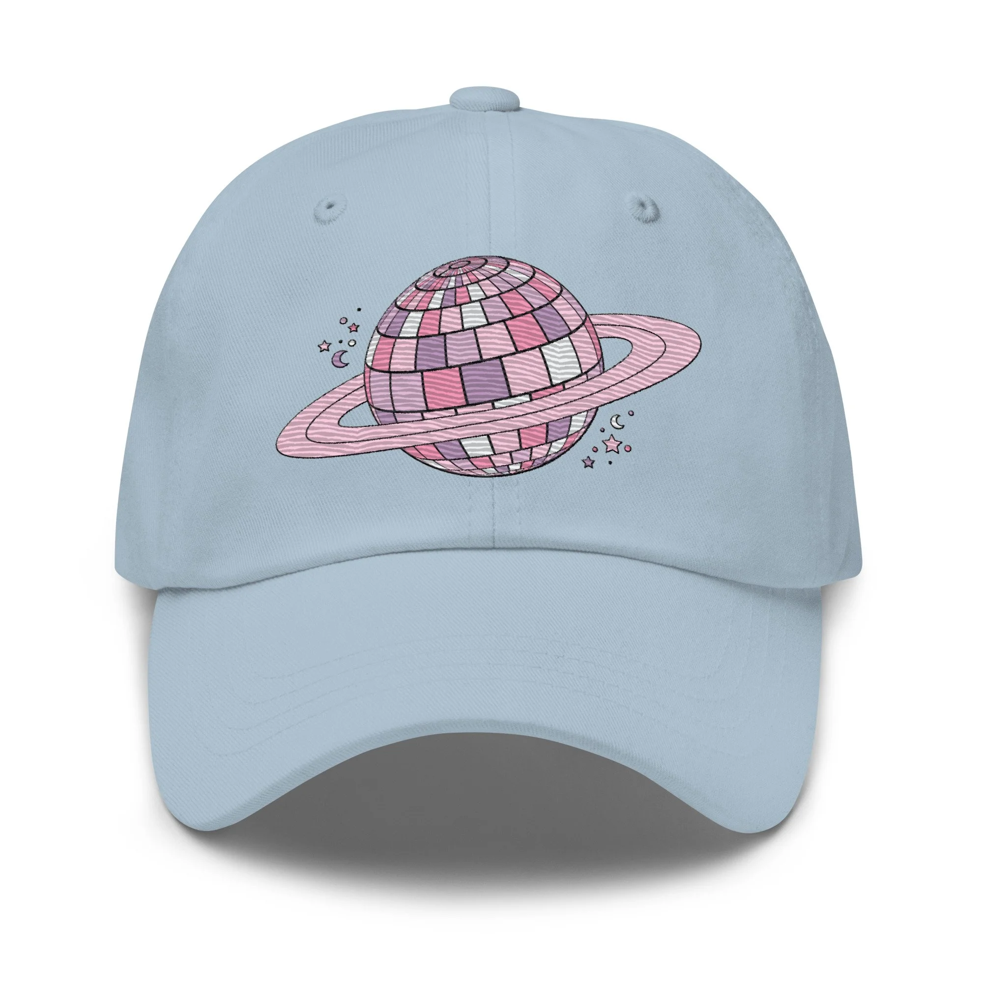 Store › Disco Saturn Embroidered Hat Image 1 of 4 Image 2 of 4 Image 3 of 4 Image 4 of 4 Disco Saturn Embroidered Hat $25.00 Dad hats aren't just for dads. This one's got a low profile with an adjustable strap and curved visor. • 100% chino cotton twill • Green Camo color is 35% chino cotton twill, 65% polyester • Unstructured, 6-panel, low-profile • 6 embroidered eyelets • 3 ⅛” (7.6 cm) crown • Adjustable strap with antique buckle • Blank product sourced from Vietnam or Bangladesh Color: Black Stone Pink Light Blue White Add To Cart Added! Dad hats aren't just for dads. This one's got a low profile with an adjustable strap and curved visor. • 100% chino cotton twill • Green Camo color is 35% chino cotton twill, 65% polyester • Unstructured, 6-panel, low-profile • 6 embroidered eyelets • 3 ⅛” (7.6 cm) crown • Adjustable strap with antique buckle • Blank product sourced from Vietnam or Bangladesh